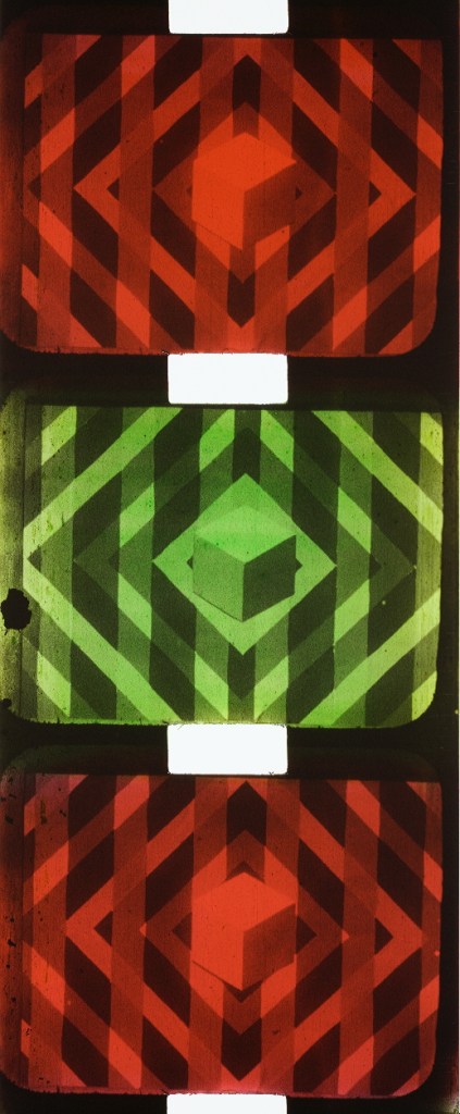 As mimetic colors – often called “natural” colors – became more widespread in the early 1930s, experimental filmmakers were among the first to embrace and push the boundaries of emerging color technologies , – Gasparcolor, Dufaycolor, Technicolor No. IV and V, and Kodachrome. Notably, Oskar and Hans Fischinger, along with Len Lye, were pioneers in working with Gasparcolor in the 1930s, producing films with brilliantly saturated colors that continue to amaze audiences today. Lloyd Jones experimented with Kodachrome two-color for [KALEIDOSCOPE],while Shigeji Ongino’s Japanese abstract animation 表現 [HYŌGEN – AN EXPRESSION] utilized a unique Japanese variant of Biocolour, an additive color process. In the 1960s, Éric Duvivier created a series of stunning experimental films on Kodachrome.
