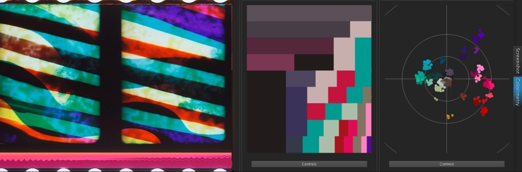 For this reason, Len Lye’s films have long been a central focus of Scan2Screen’s research. Our CEO Barbara Flueckiger has documented and analyzed multiple prints of Lye’s films at institutions including the Museum of Modern Art in New York, the Celeste Bartos Film Preservation Center in Pennsylvania, the BFI National Film Archive in London. Her research involved detailed examination of the films’ material and color properties, including colorimetric measurements and the creation of corresponding visualizations.