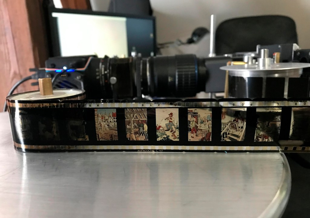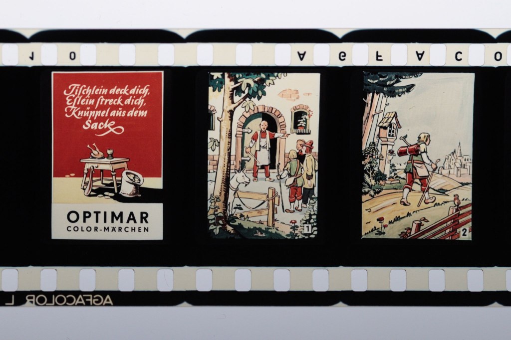 Nazanin Sharifan focused on digitizing Optimar Kinder-Kino films produced by Agfa, again utilizing Scan2Screen’s multispectral technology. These Agfacolor L NT chromogenic color positive films from the 1950s were designed for children’s slide-in projectors, forming short, flat 35mm film strips rather than continuous reels. This posed a technical challenge, as the Scan2Screen system requires continuous film transport to maintain mechanical stability and precision frame-by-frame capture. To address this, a custom sliding film holder was designed to stabilize individual frames and allow controlled manual movement without image vibration.